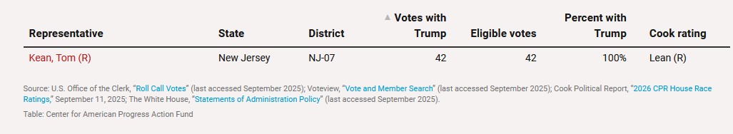 Tom Kean ran as a politician who works across the aisle. But so far, Kean has voted for Trump's agenda 100% of the time, based on information compiled by the Center for American Progress.